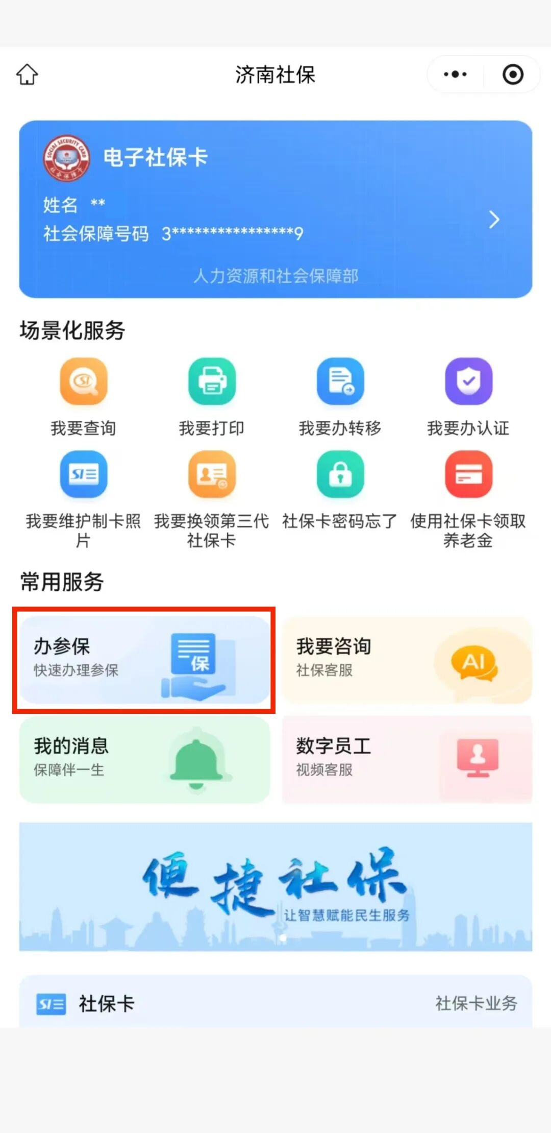 (2)济南社保微信公众号—“办社保”—“网办直达”—“办参保”。