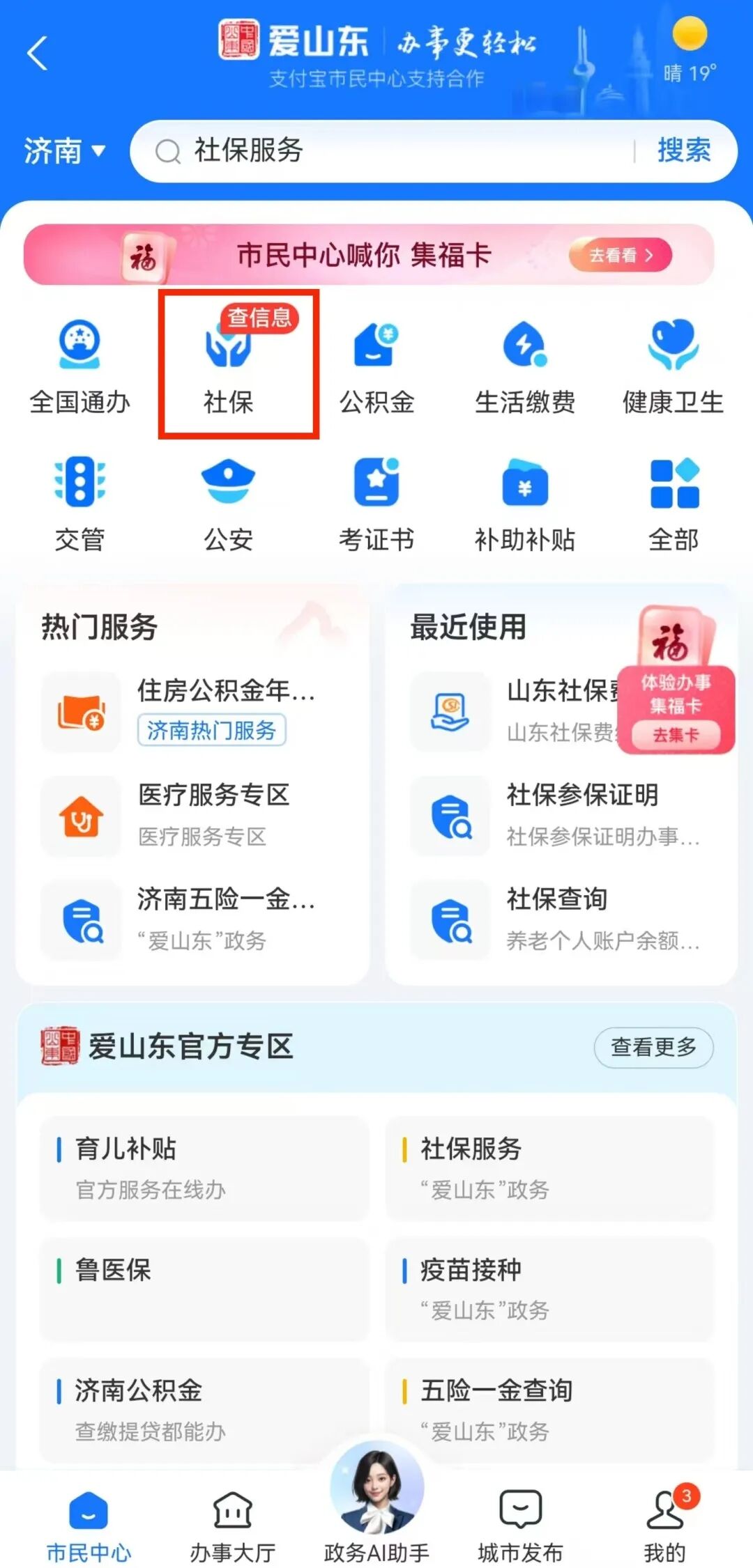 (2)“支付宝”APP—“市民中心”—“社保”—“社保查询”