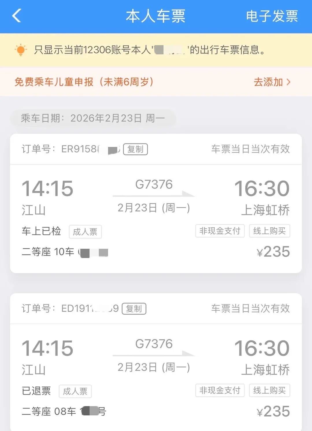 24日下午,极目新闻记者联系到上述网友。从其提供的订单截图来看,这两张车票均为2月23日14时15分开出的G7376次列车,且均是线上购买。其中一张车票的状态显示为“已退票”。该网友告诉记者,自己是在开车前一分钟退掉了其中一张票,但被扣除了20%的手续费,“如果是在开车后才发现的,那这张票可能就退不掉了。”