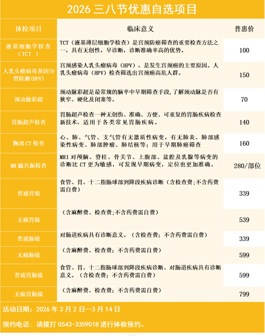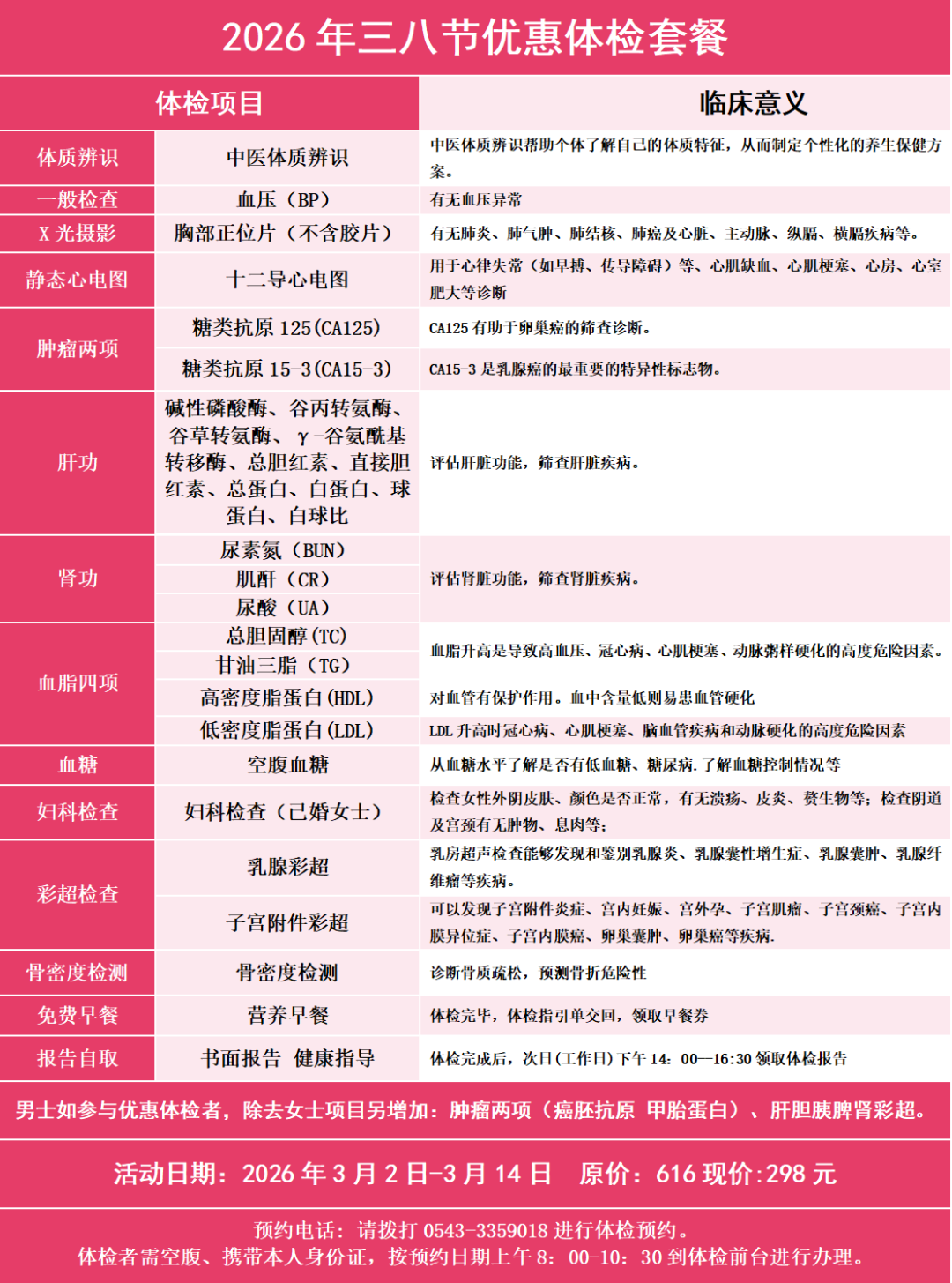 为引导广大女性重视健康、及时了解身体状况、筛查潜在疾病、做到早干预早治疗,树立“早查早治、未病先防”的健康理念,增强自我保健意识,值此三八妇女节来临之际,滨州市中医医院(滨州医学院附属中医医院)特开展“呵护健康、绽放美丽”惠民体检活动,以实际行动关爱女性健康,传递温暖与关怀。愿每一位女性,都能在优雅与美丽之外,稳稳守住健康。祝您三八妇女节快乐!