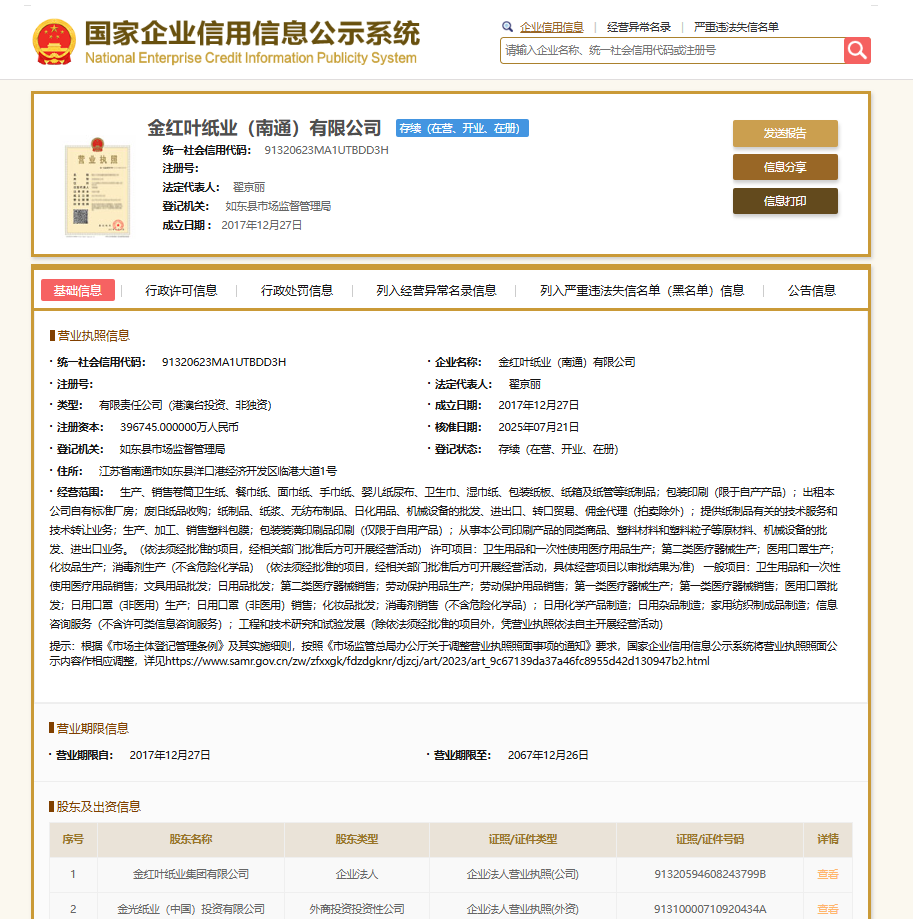 公开信息显示,金红叶纸业(南通)有限公司成立于2017年12月27日,注册资本396745万元。2025年7月21日,公司负责人由黄志源变更为现任法定代表人翟京丽。公司股东为金红叶纸业集团有限公司和金光纸业(中国)投资有限公司。