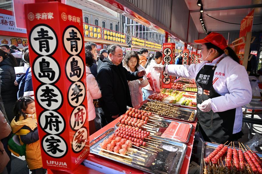 People buy candied fruits at a fair in Qingdao, east China's Shandong Province, Feb. 17, 2025. (Xinhua/Li Ziheng)