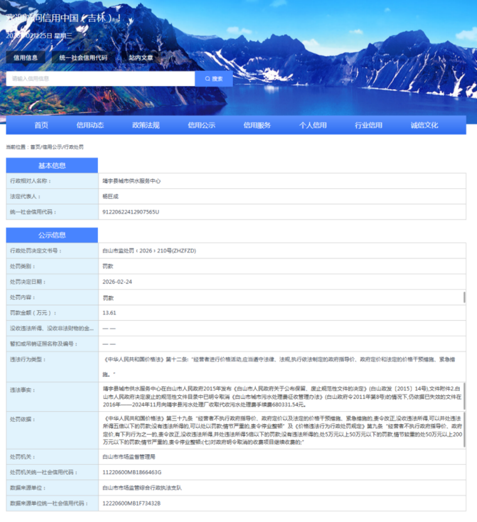 近日,信用中国(吉林)发布行政处罚信息,靖宇县城市供水服务中心因依据已失效的文件在2016年至2024年11月向靖宇县污水处理厂收取代收污水处理费手续费680331.54元,根据《中华人民共和国价格法》《价格违法行为行政处罚规定》相关规定,被白山市市场监督管理局依法作出行政处罚决定,处以13.61万元罚款。