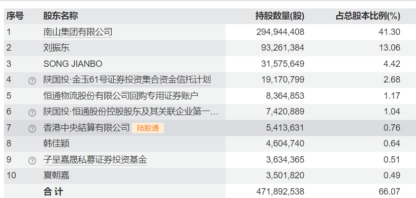 从股权结构来看,目前,刘振东持有恒通股份9326.14万股,占公司总股本的13.06%,为其第二大股东;南山集团有限公司持有恒通股份2.95亿股,持股比例41.3%,为其大股东。股权穿透后,恒通股份实际控制人为龙口市东江街道南山村村民委员会。