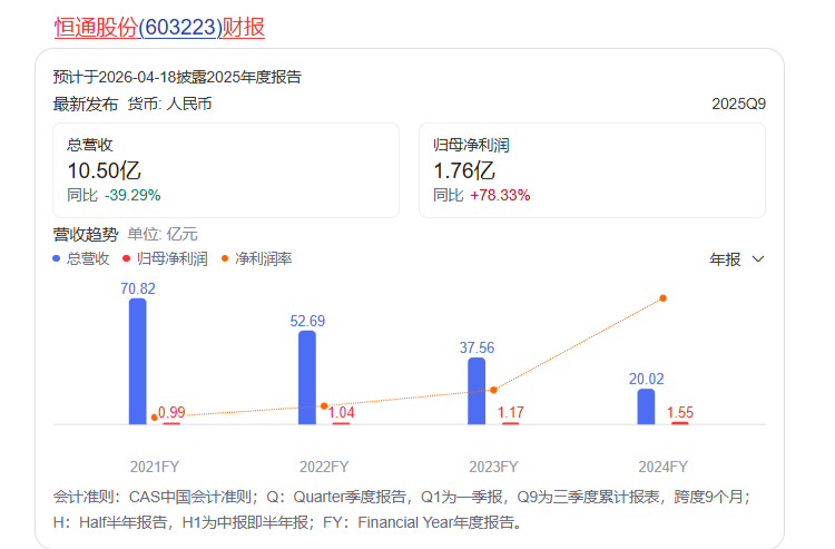 业绩方面,2022年至2024年,恒通股份营业收入分别为52.69亿元、37.56亿元和20.02亿元,营收逐年下滑;但同期,公司归母净利润却逐年增长,分别为1.04亿元、1.17亿元和1.55亿元。