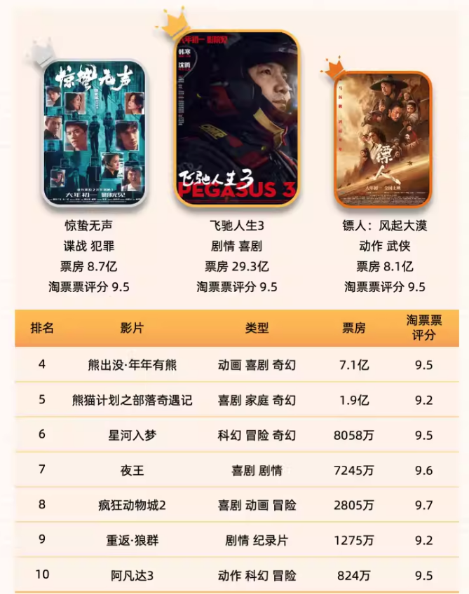 总结2026春节档影片,竞争格局呈现“单片领跑、梯队分明”的特征。《飞驰人生3》强势领跑,以29.3亿票房位列2026年春节档票房冠军,票房占比高达50.8%,断层式领先,《惊蛰无声》《镖人:风起大漠》分别以8.7亿、8.1亿票房分列第二、第三名。