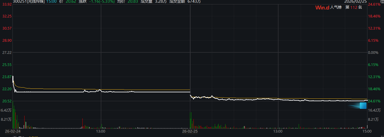 2月24日,光线传媒20CM跌停,幸福蓝海下跌18.99%。2月25日,光线传媒继续下跌超5%,幸福蓝海止跌微涨0.9%。