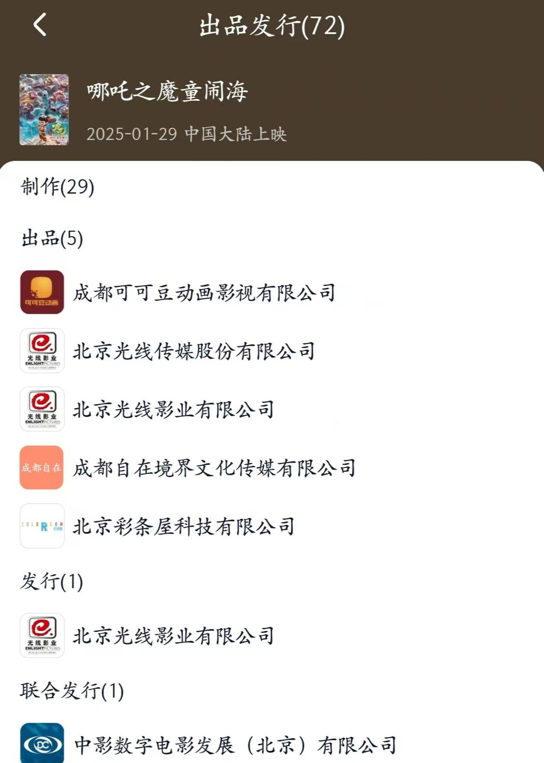《哪吒2》出品发行方名单。来源:灯塔专业版