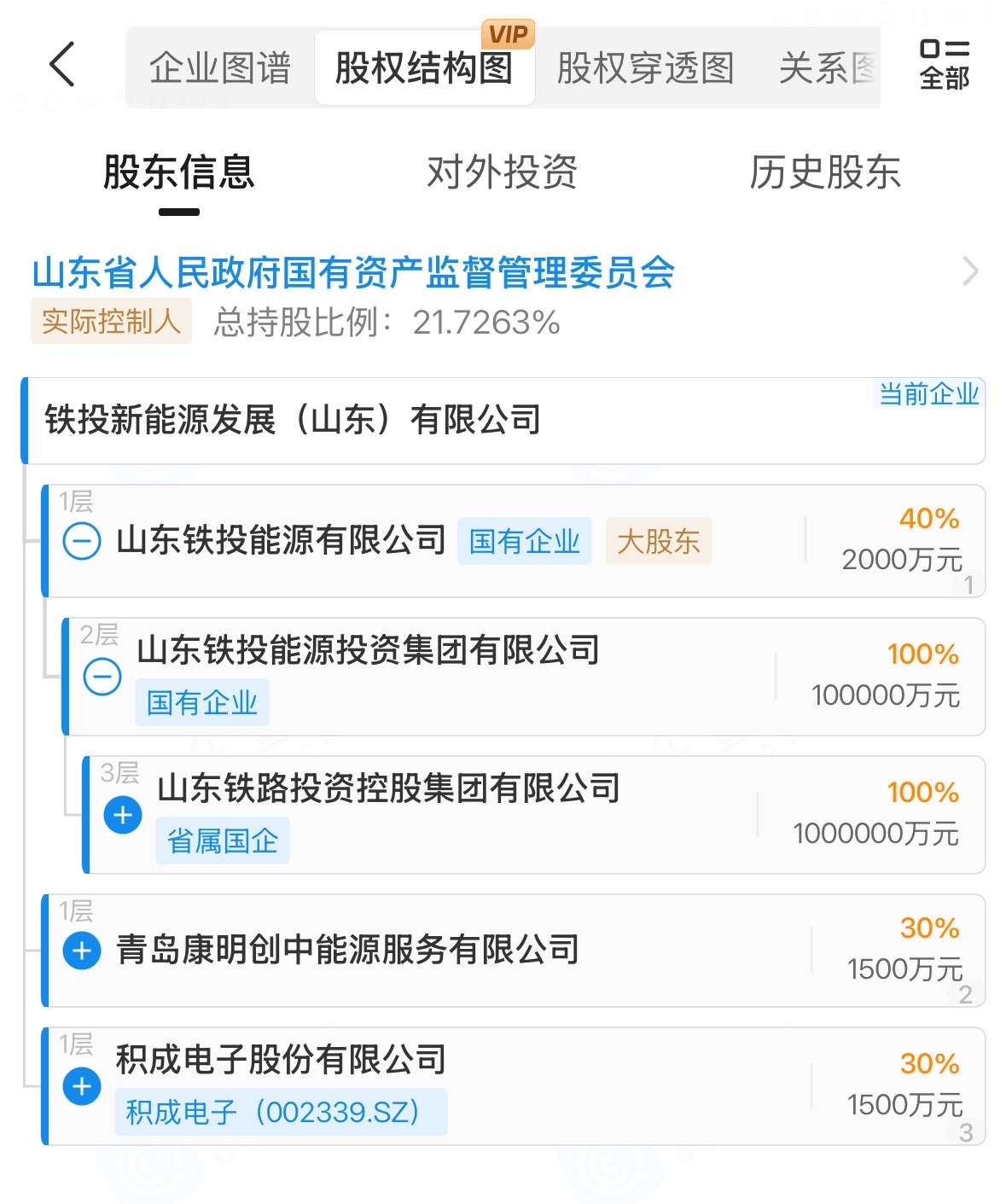 铁投新能源发展(山东)有限公司成立于2020年12月,注册资本5000万元。股权穿透显示,山东铁投能源有限公司、积成电子(002339.SZ)、青岛康明创中能源服务有限公司分别持有其40%、30%、30%的股份。其中,山东铁投能源有限公司为山东铁投集团全资子公司——山东铁投能源投资集团有限公司的全资子公司。铁投新能源发展(山东)有限公司实际控制人为山东省国资委。