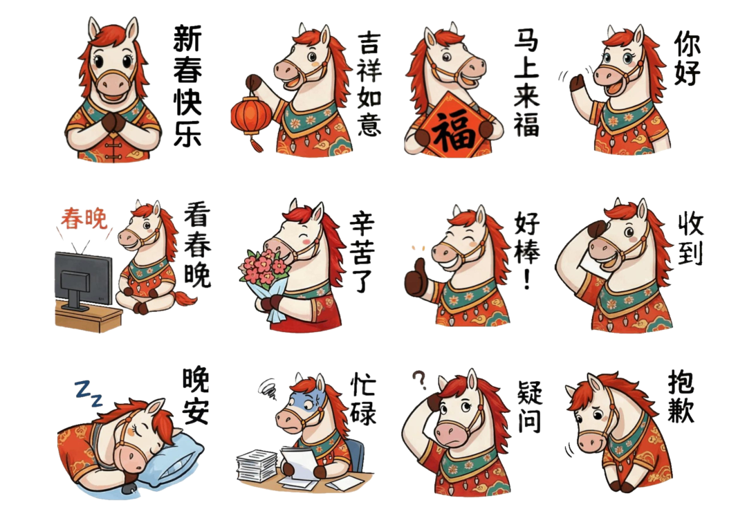 从新春问候的“新春快乐”“马上来福”“吉祥如意”,到工作场景中的“好棒”“辛苦了”;从日常往来的“你好”“收到”,到深夜值守的“忙碌”“晚安”——每一帧都延续了唐马的圆润憨态,马儿或拱手作揖、或点头称赞、或歪头酣睡,既接地气又充满治愈感。上线短短一周,下载量突破千人次,对话框里不时跳出的小马,成了同事间无需言说的默契暗号。有职工留言:“发个‘康康’,比打字更温暖。”