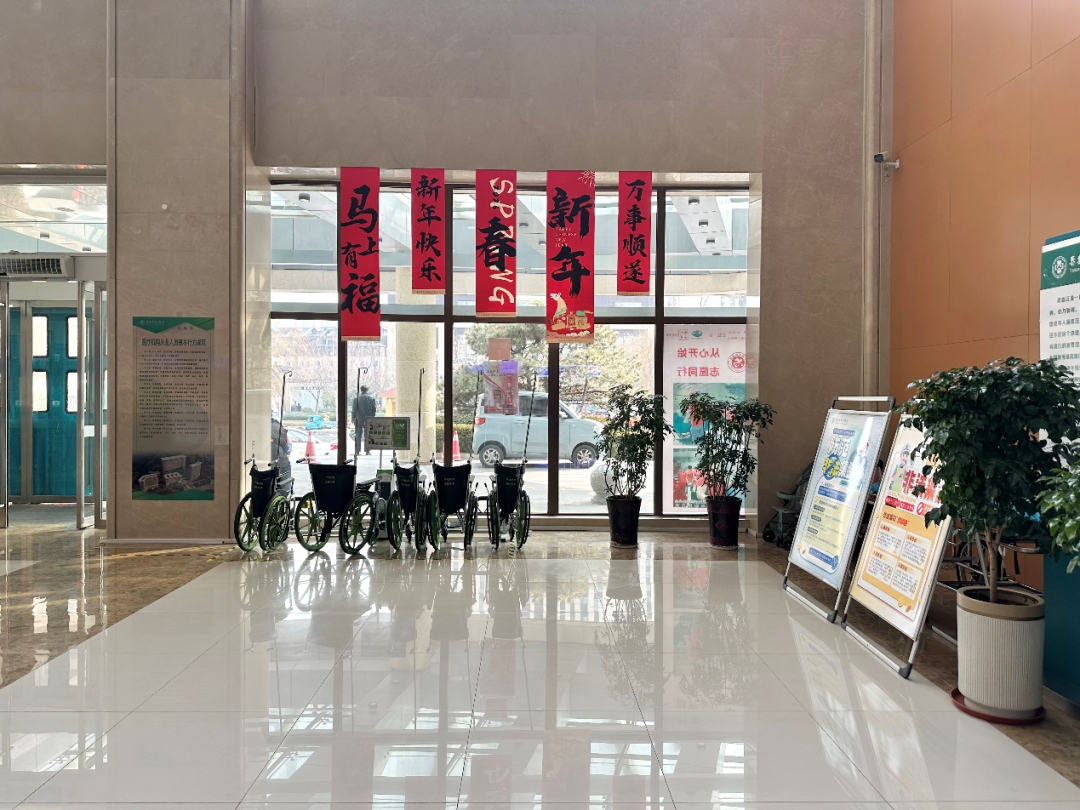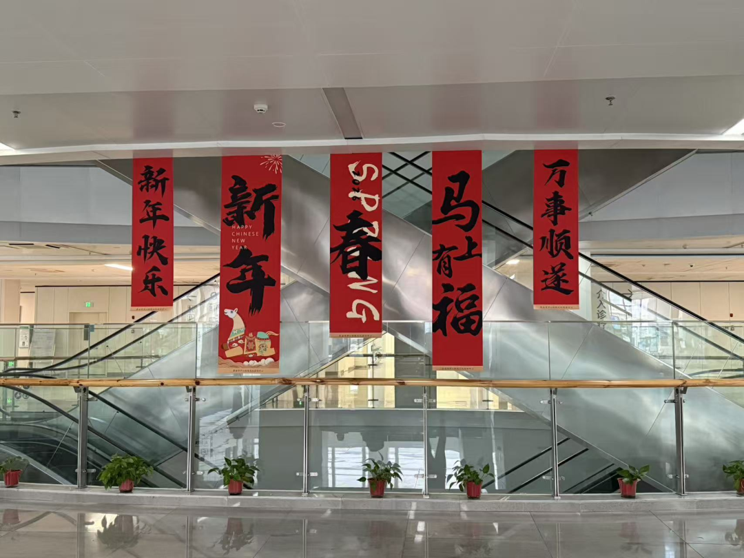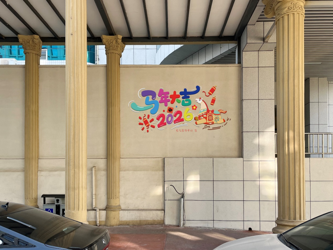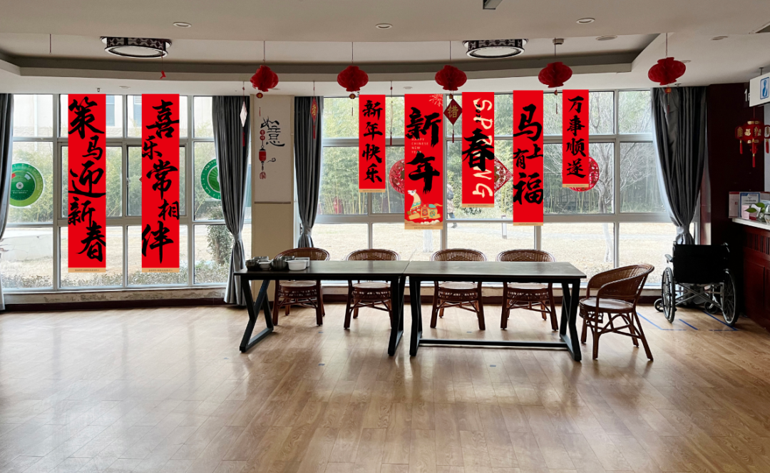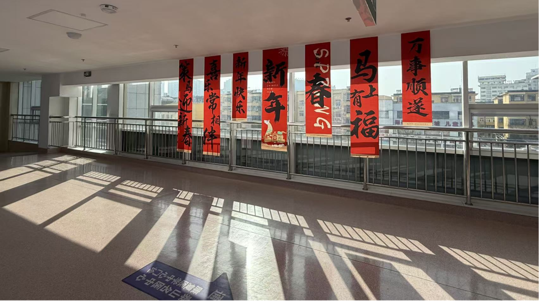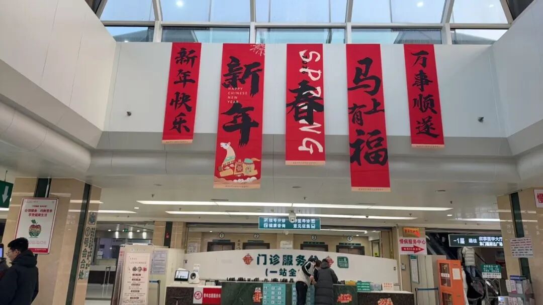 春节前夕,院区的悄然变化更令人会心一笑。大红色的新春挂副上,苍劲的书法字体书写着“新春快乐”“万事顺遂”“马上有福”等朴素祈愿,憨态可掬的“康康马”跃然于传统纹饰之间。窗贴系列则巧妙利用镂空与透光工艺,白日映暖阳,入夜透柔光,将医院的严肃氛围化为融融暖意。