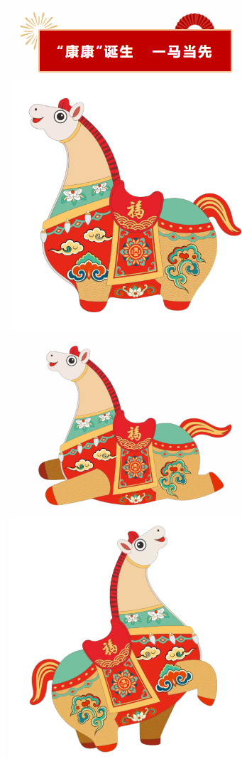 作为此次新春文创的主角,“康康马”的诞生并非一蹴而就。文化宣传中心深挖传统文化富矿,从唐代陶俑的圆润筋骨与昂扬姿态中汲取灵感,将“胖墩墩、昂首立”的唐马造型与现代审美巧妙融合。马身纹饰取自中国传统吉祥图谱,云雷纹流转如意,卷草纹绵延生机,每一处细节皆是对医院“仁心仁术、生生不息”精神的视觉转译。
