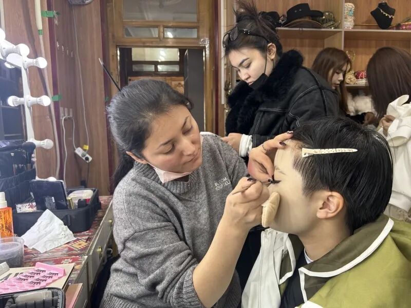 走进幸福之花旅拍店,大厅里摆满了各种特色服饰、头饰、鞋子,造型师忙着根据不同顾客的特点搭配服装,一边的化妆间里,25岁的化妆师努尔斯曼古丽・玉苏普忙个不停。有着6年化妆经验的她是店里名副其实的“老手艺人”。只见她手持化妆刷,细细勾勒游客的眼线,又小心翼翼为游客戴上缀着珠饰的特色头饰,从发型设计到睫毛粘贴,每一个细节都处理得一丝不苟。即便前来化妆的游客排起了长队,她的动作依旧有条不紊,化妆质量丝毫没有因忙碌打折扣。