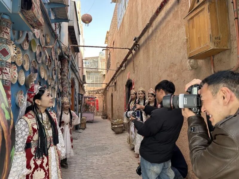 沿着石板路继续前行,古城的各个角落都能看到旅拍的场景,摄影师们带着游客有序拍摄,彼此熟络又默契。遇到出片的拍摄点位,大家会自觉排队等候;拍摄过程中缺了小道具,同行之间也会热情相借。“我们干旅拍的,说到底都是为了让顾客拍出满意的照片,让大家通过镜头看到最美、最真实、最和谐的喀什古城。”努尔阿力木说,在他看来,每一张旅拍照片,都是向外界展示喀什古城魅力的一张小小名片。