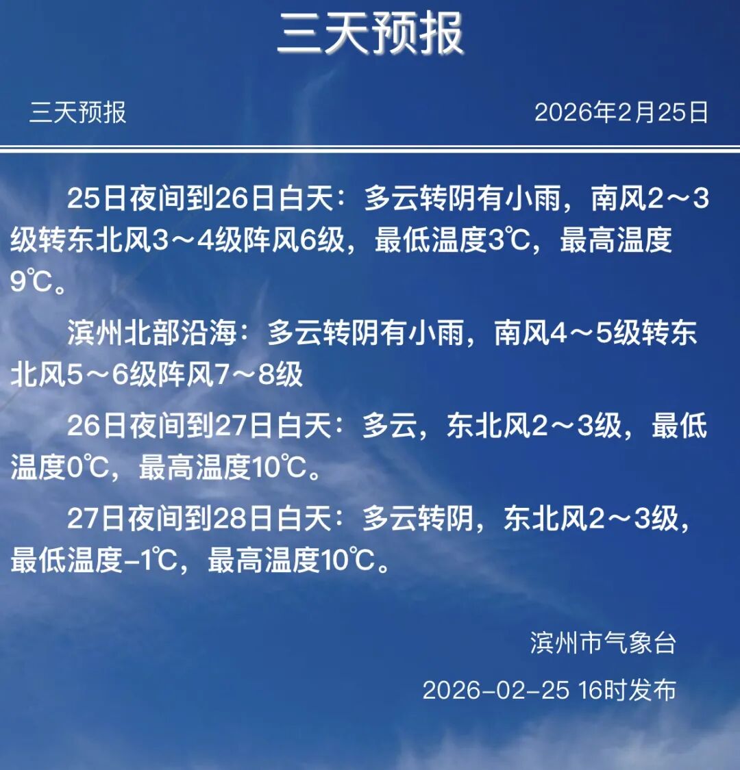 滨州市气象台2026年02月25日16时05分发布北海新区大风蓝色预警信号。受冷空气影响,预计26日早晨到下午北海新区马山子镇东北风风力较大,内陆地区4级阵风6~7级,北部沿海及海面5~6级阵风7~8级。请注意防范。