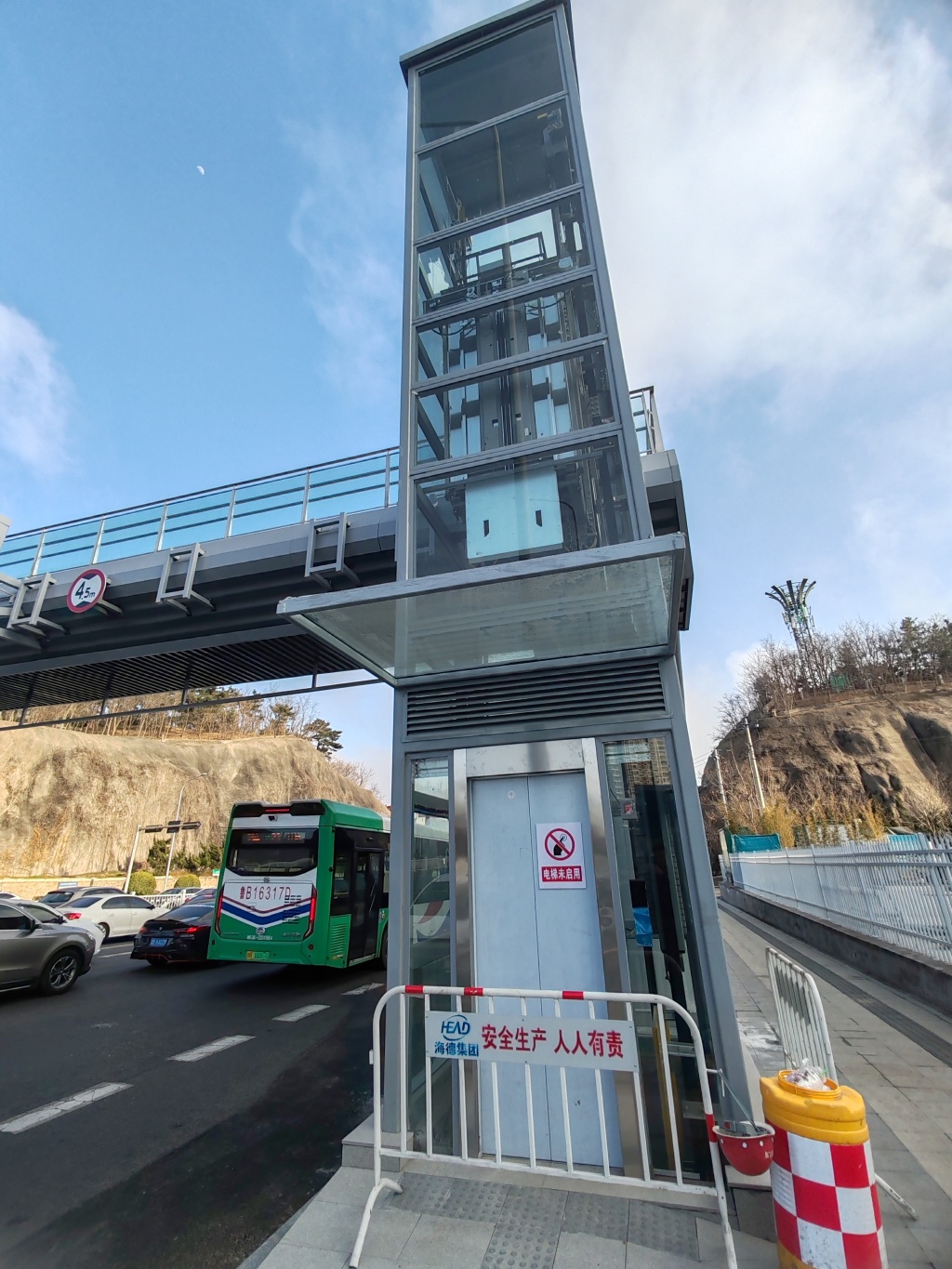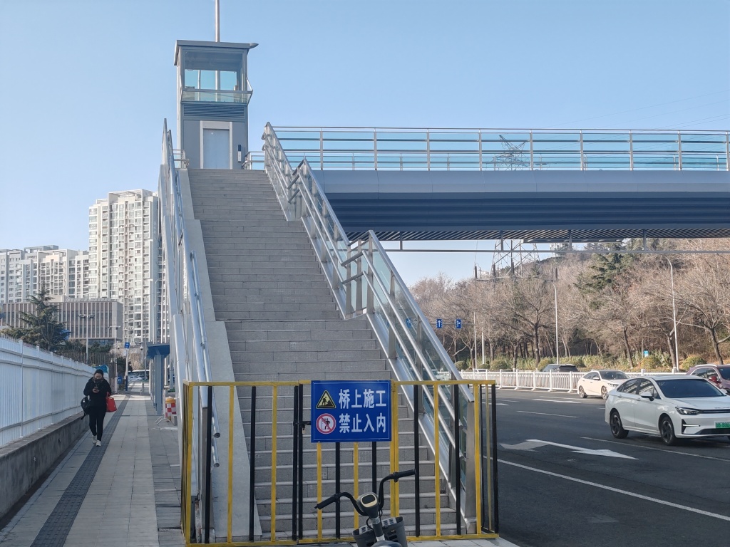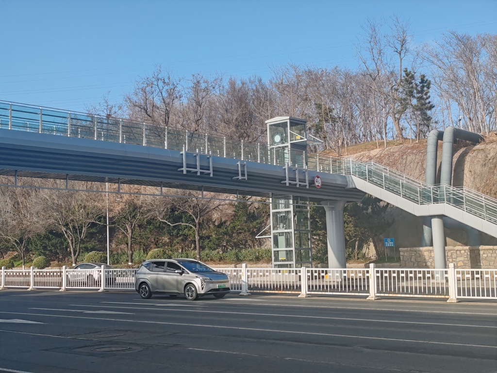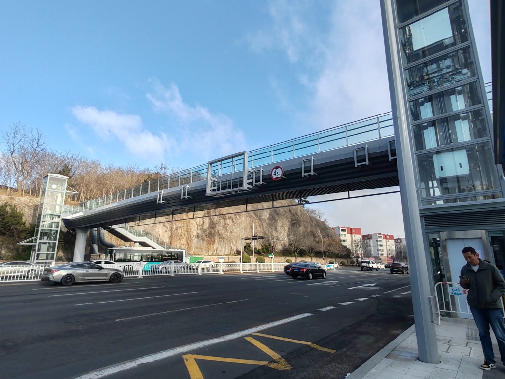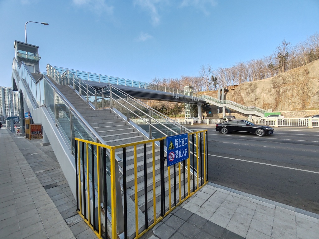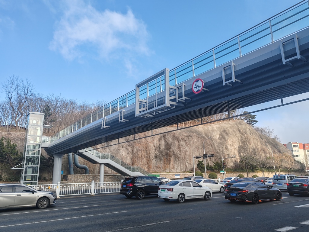 2月25日,在福州北路与奉化路路口处,一座过街天桥已经施工到位,电梯也安装完成。据现场施工人员介绍,天桥投入使用的时间已经快了。据了解,在福州北路的奉化路、延吉路路口新建两处人行过街天桥,实现人车分流,全面提升道路通行效率和安全性。(半岛全媒体记者王滨)