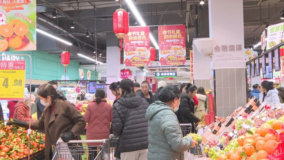生鲜果蔬等生活消费品市场同样购销两旺。走进家家悦中心店,映入眼帘的是满满当当的货架:新鲜蔬菜码放整齐,水果区飘着清香,海鲜池里龙虾、帝王蟹活蹦乱跳。店员们推着补货车穿梭于货架之间,随时补充被拿空的商品。不少市民则分区域仔细挑选,把礼盒、干果、酒水、生鲜食材统统装进购物车。
