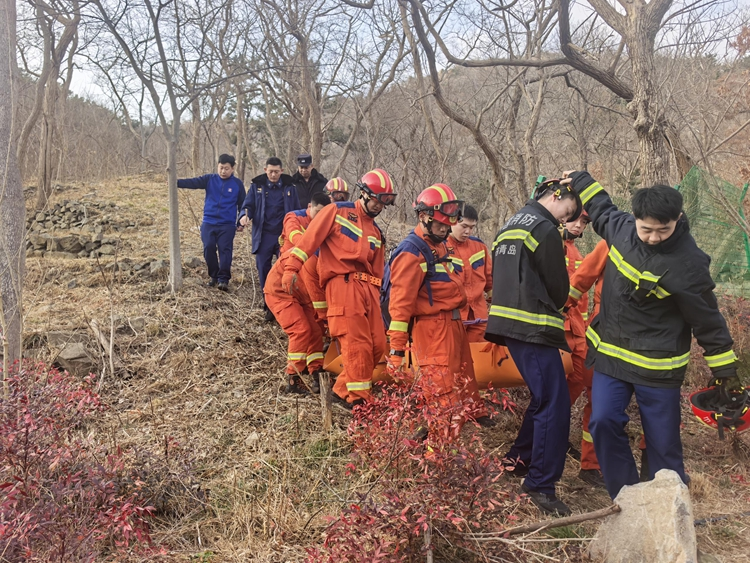 由于事发位置山路崎岖,救援人员与崂山公安分局情指中心进行实时定位,确保了正确的行进方向,最终成功找到了受伤的韩先生。现场发现,韩先生腿部受伤,无法独立行走。经现场120急救人员初步检查、固定包扎后,救援人员决定立即将其转移下山。为避免对伤者造成二次伤害,沙子口派出所民警与消防队员紧密配合,小心翼翼地将韩先生固定在担架上,接力抬至早已等候在山下的120急救车上。