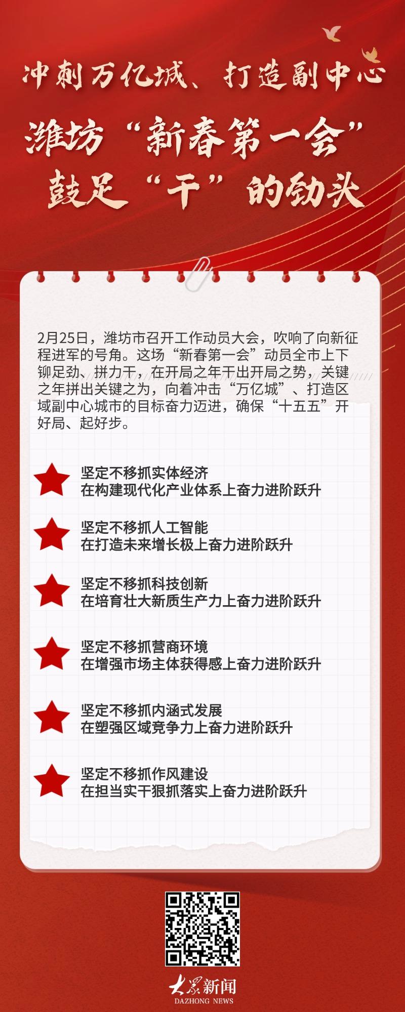 马踏春风,战鼓催征。2月25日,潍坊市召开工作动员大会,吹响了向新征程进军的号角。这场“新春第一会”动员全市上下铆足劲、拼力干,在开局之年干出开局之势,关键之年拼出关键之为,向着冲击“万亿城”、打造区域副中心城市的目标奋力迈进,确保“十五五”开好局、起好步。