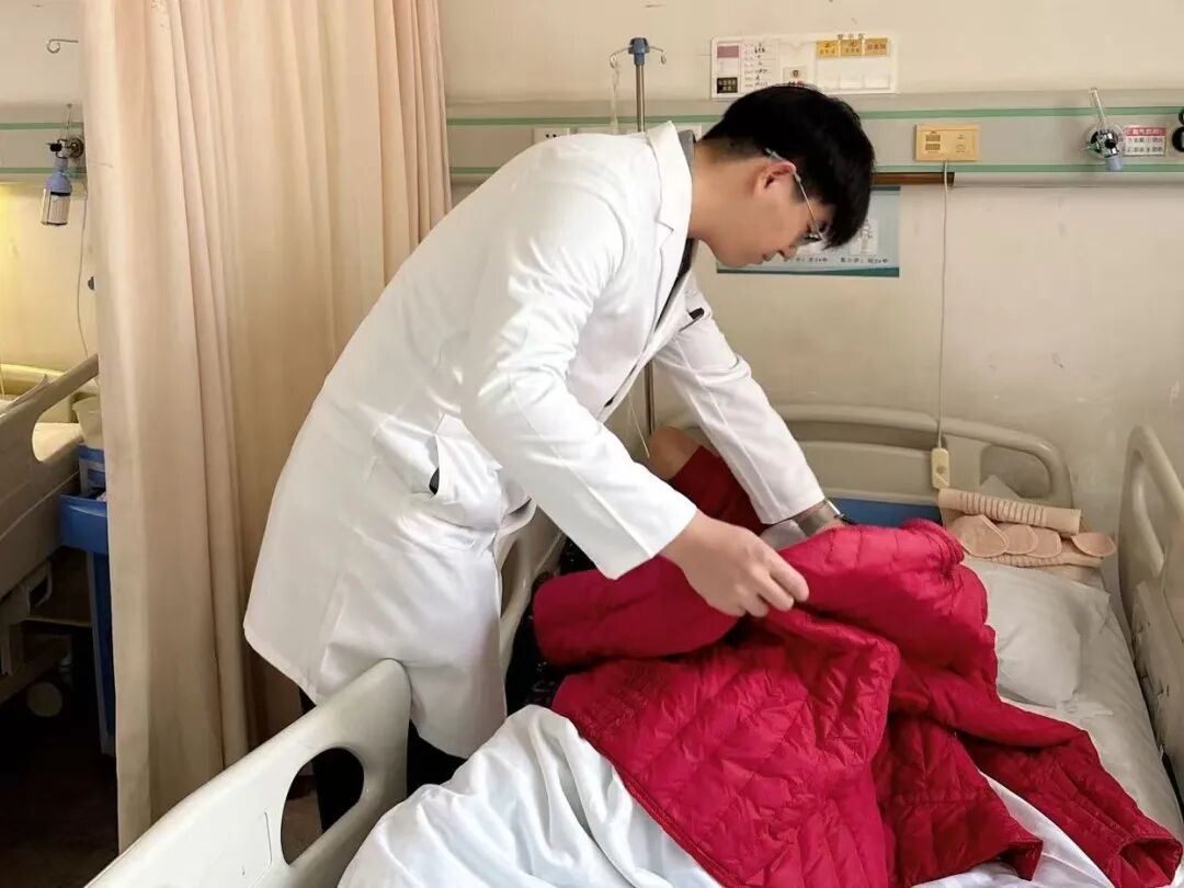 作为一名坚守临床一线的骨科住培学员,刘昊来深知,节假日期间医疗安全防线更需筑牢守稳。他仔细梳理科室留院过年患者的病历资料,认真核对每一条医嘱与治疗方案,严谨评估患者病情变化,全力确保节假日期间工作标准不降低、服务不打折扣。因病情需要无法回家团聚的患者,心中难免牵挂与焦虑,查房过程中,刘昊来在细致检查恢复情况的同时,主动与患者沟通交流,舒缓他们的紧张情绪。其间,他发现一位患者休息时衣着单薄,便随手为患者披上一件厚实的红外套。这一看似微小的举动,承载着暖心的人文关怀,这抹喜庆的“新年红”,在寒冬里为无法归家的患者送去了安心与温暖。医者仁心,坚守岗位就是对生命最庄重的承诺。