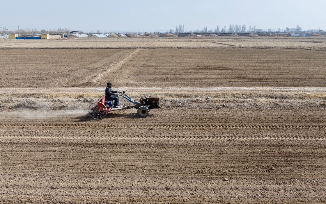 2月24日,在宁夏银川市贺兰县金贵镇银河村,农民驾驶农机平整土地(无人机照片)。新华社