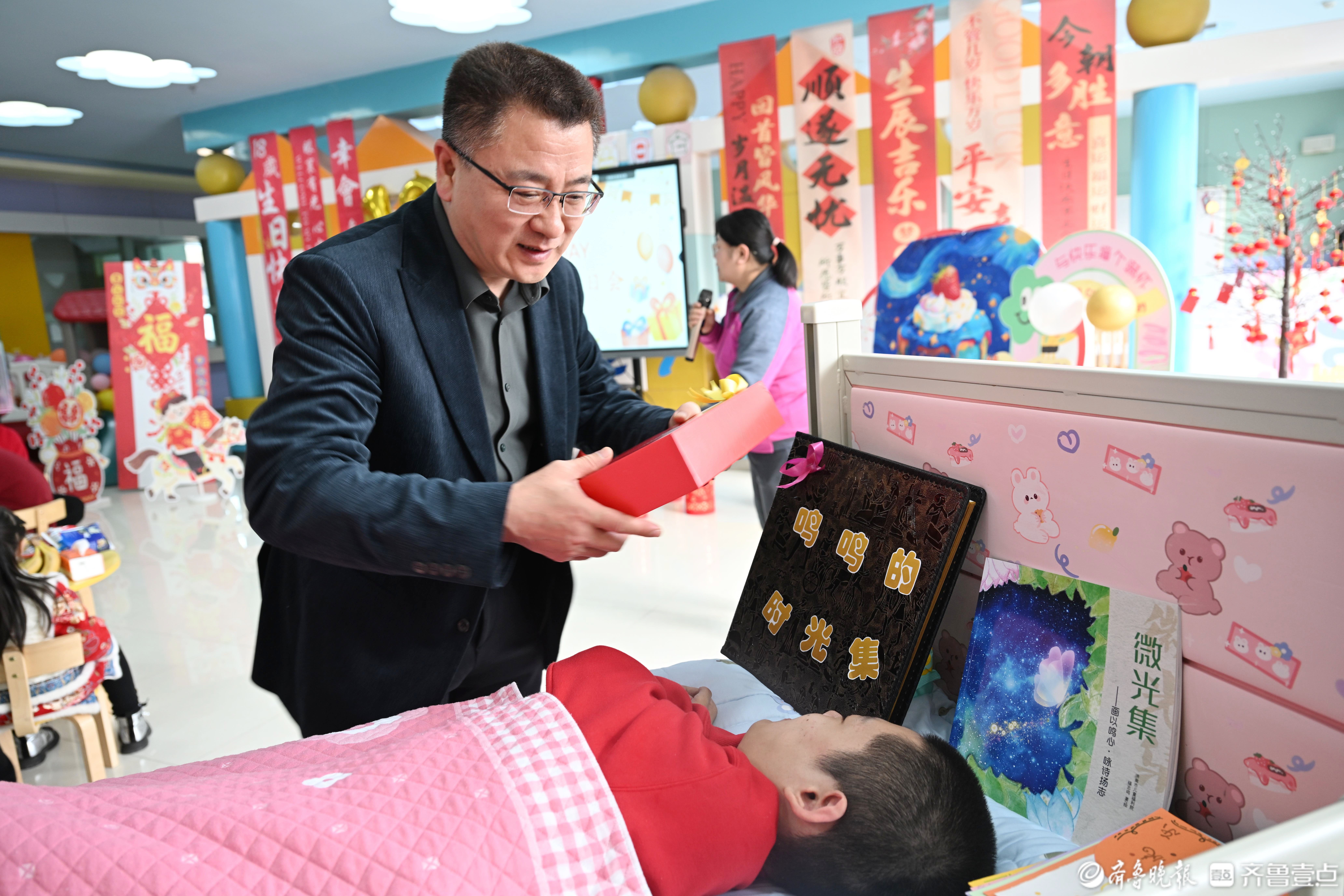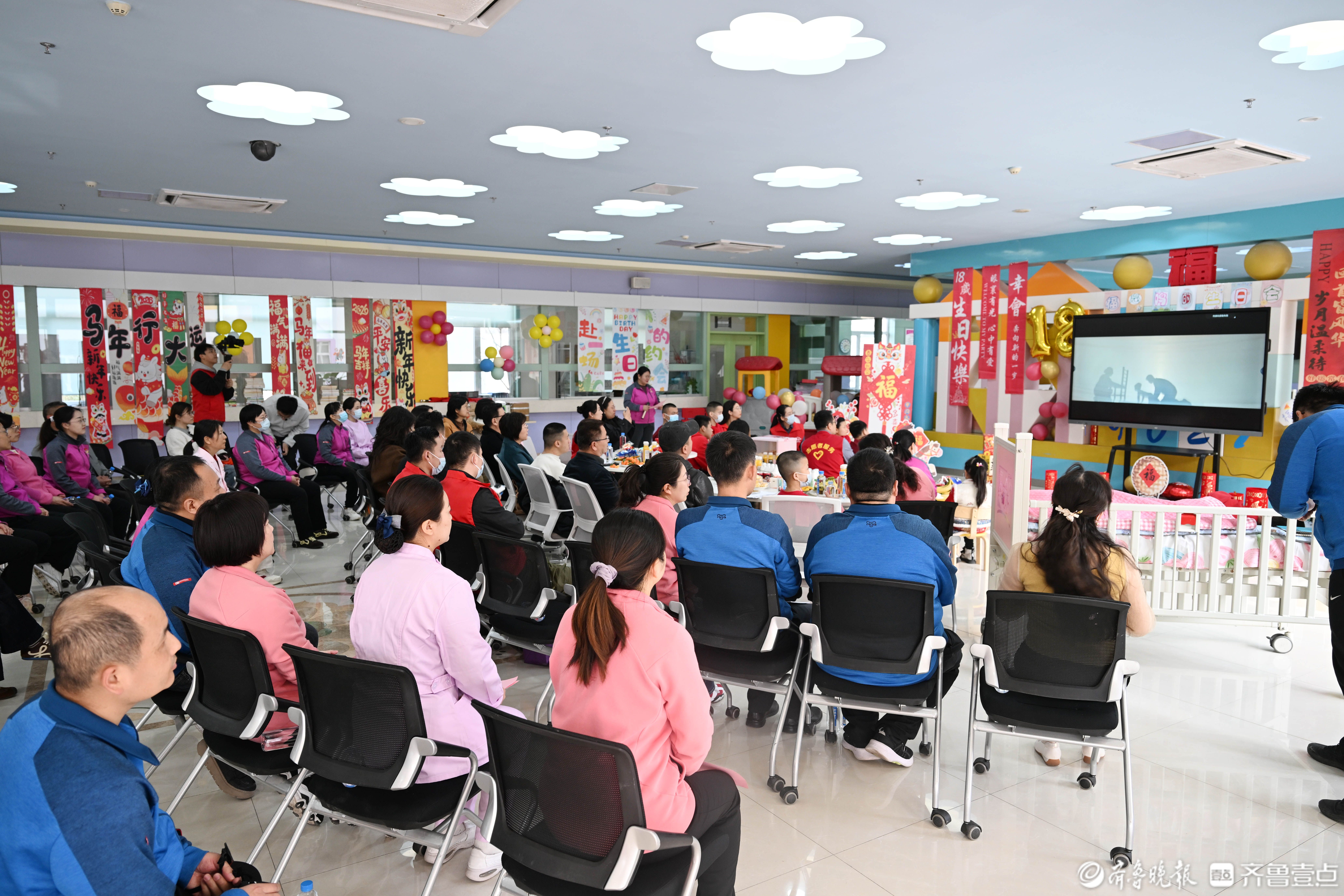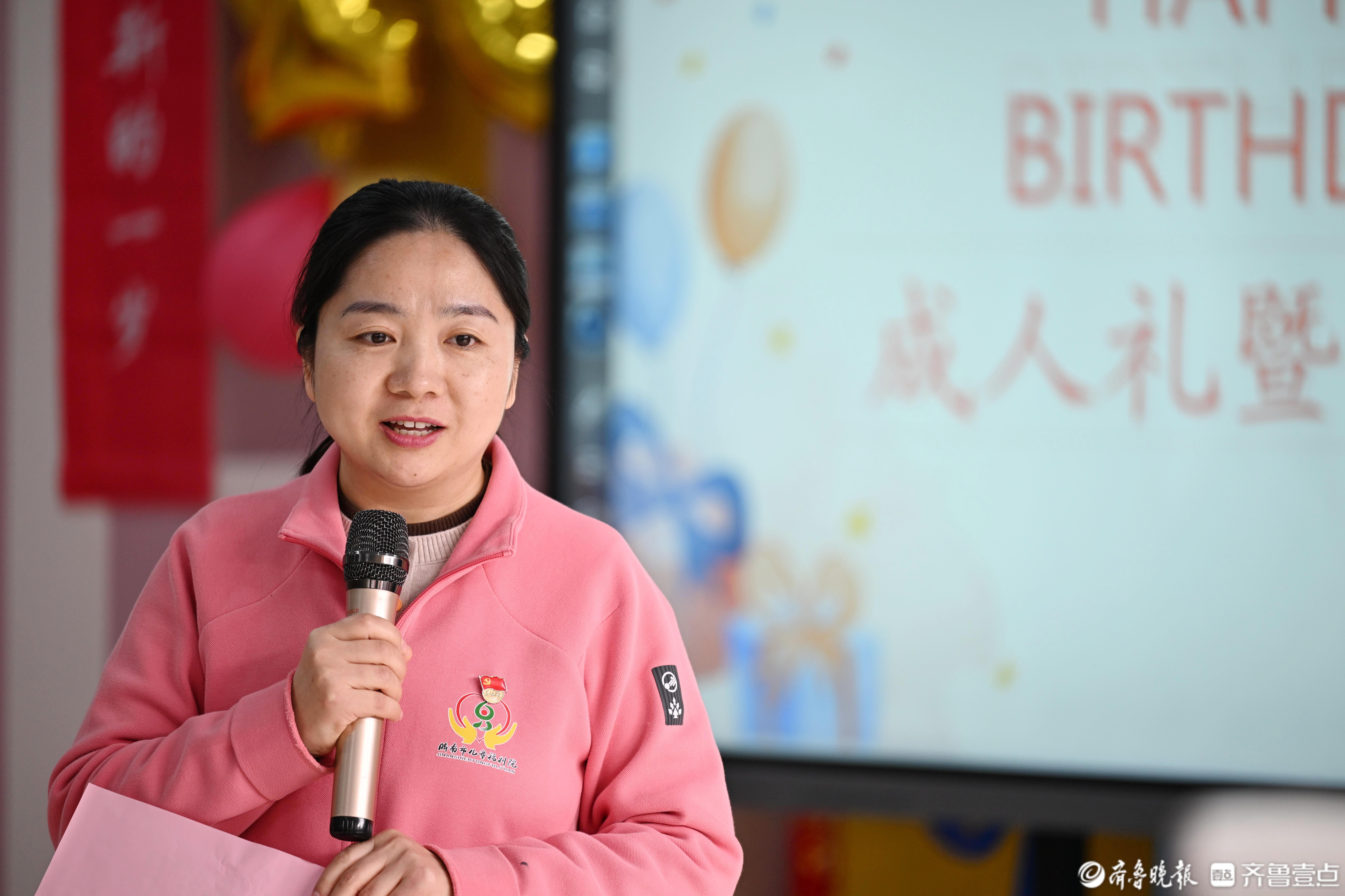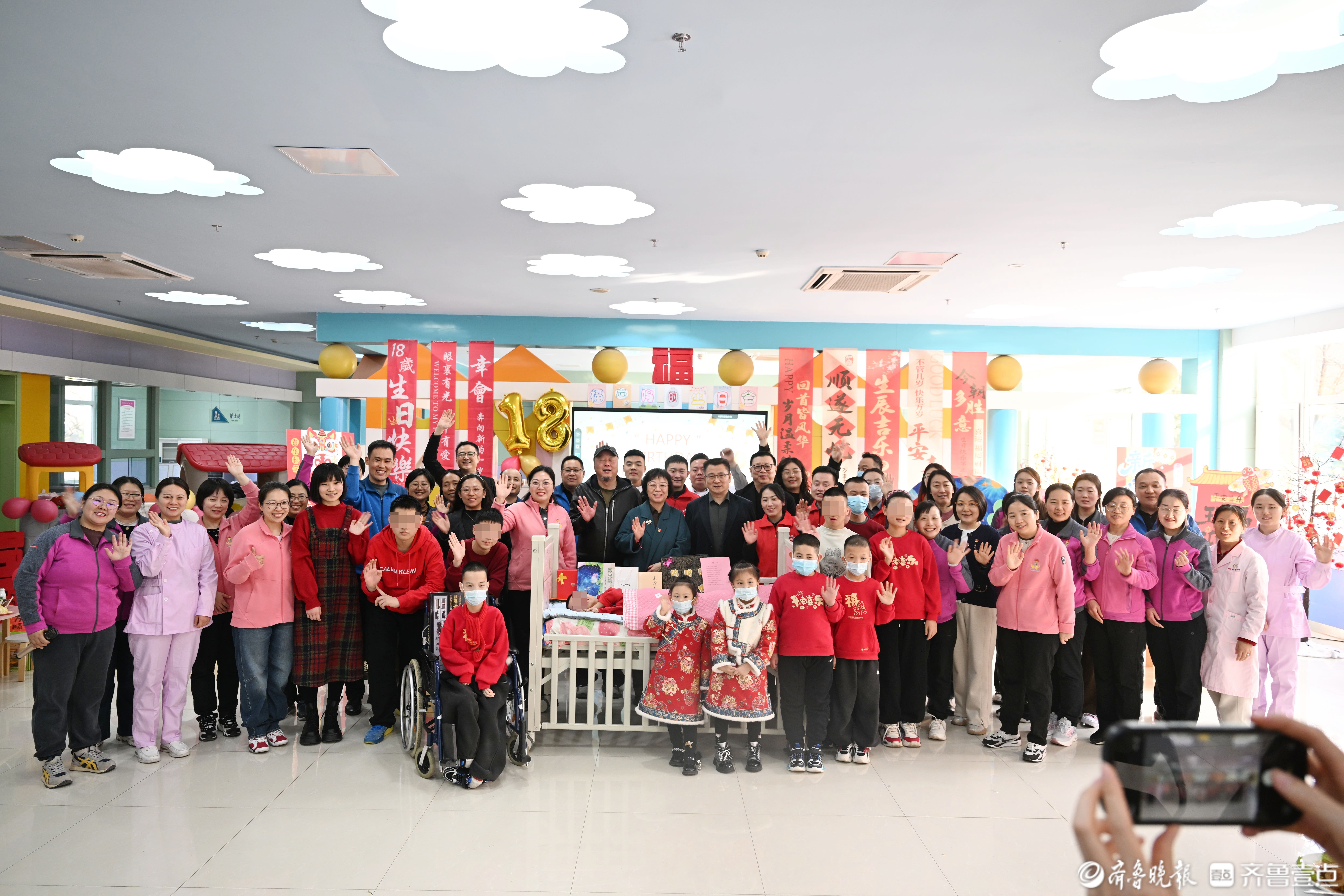 2月24日,在济南市儿童福利院,一场暖心的“福娃”成人礼暨生日会正在进行中。当日是18岁的“福娃”鸣鸣的生日,福利院的“亲亲妈妈”们,众多爱心人士志愿者,还有当月过生日的“福娃”一起与鸣鸣共度这次难忘的成人礼。
