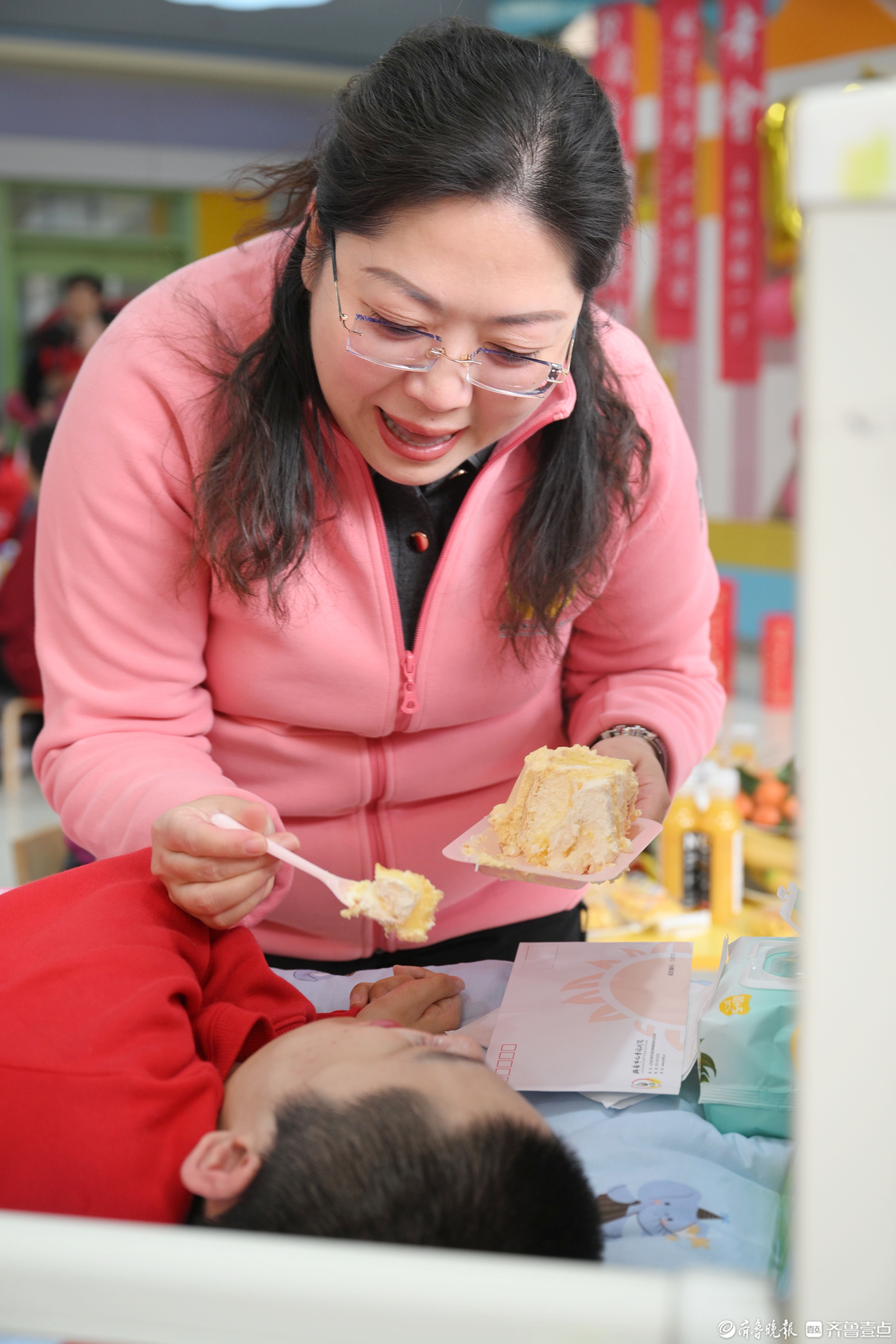 福利院院长曹慧子喂鸣鸣吃生日蛋糕。