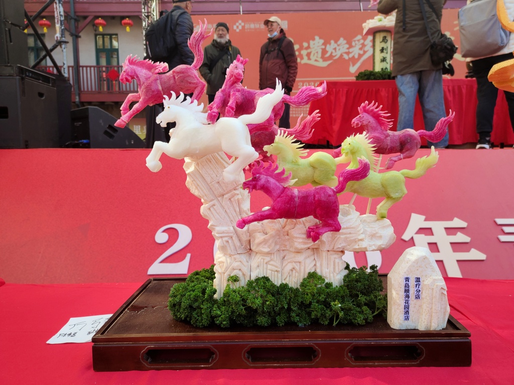 除了和徒弟合作的《盛世瓜灯》,他还带来了作品《马到成功》,线条流畅、肌肉感十足,马匹回头造型难度颇高,成为现场焦点。