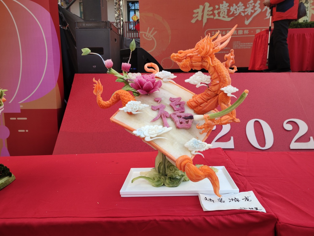 岳振东从事食品雕刻20余年,连续十余届参与萝卜雕刻大赛,见证了这项技艺的迭代升级。“现在的作品体量更大、技法更丰富,还融入了榫卯、钢架结构、灯光设计,既传统又现代,观赏性强了很多。有的作品雕刻精细,接近于写实手法;作品大气磅礴、惟妙惟肖。”