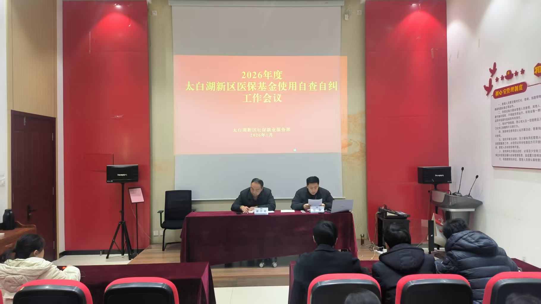 近日,太白湖新区社保就业服务部组织召开2026年全区医保基金使用自查自纠工作会议。太白湖新区社保就业服务部全体医保工作人员,全区各定点医疗机构院长及医保办负责人、定点零售药店负责人、长护险定点机构负责人参加会议。