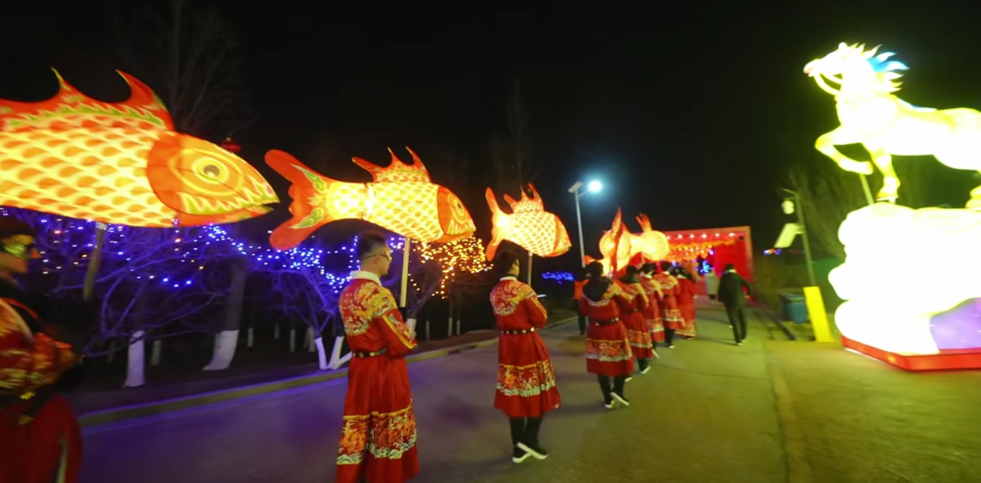 一盏盏流光溢彩的鱼灯在夜色中摇曳,仿佛真的鱼儿在灯海中游动。孩子们追着鱼灯跑,大人举起手机追着拍。鱼灯所到之处,欢声笑语不断。鱼灯寓意“年年有余”。
