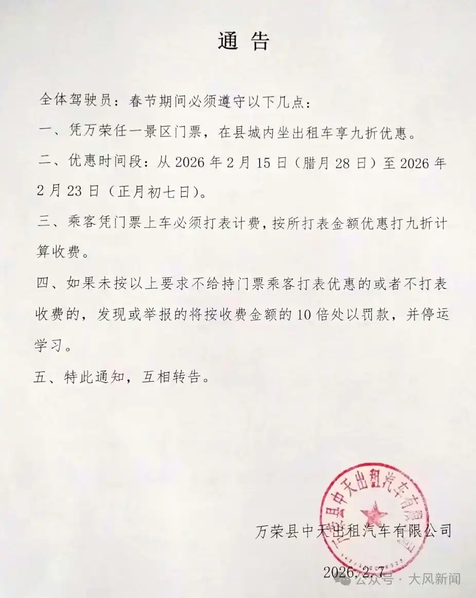 万荣县中天出租汽车有限公司2月7日出具的《通告》称,从2月15日至2月23日,若没有给持门票的游客打表优惠,或不打表收费,发现或举报的将按收费金额的10倍处以罚款,并停运学习。