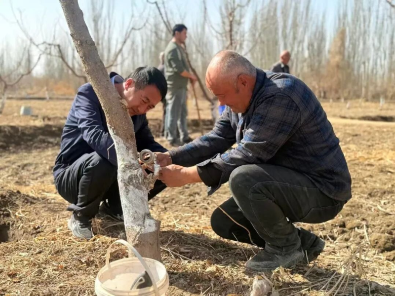 技术人员指导果农嫁接杏树。艾孜再姆 摄