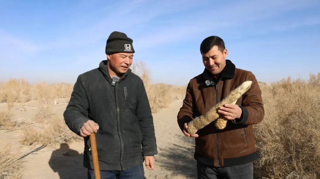 护林员展示刚刚挖出的肉苁蓉。喀什地区融媒体中心 实习记者尉旭升 摄