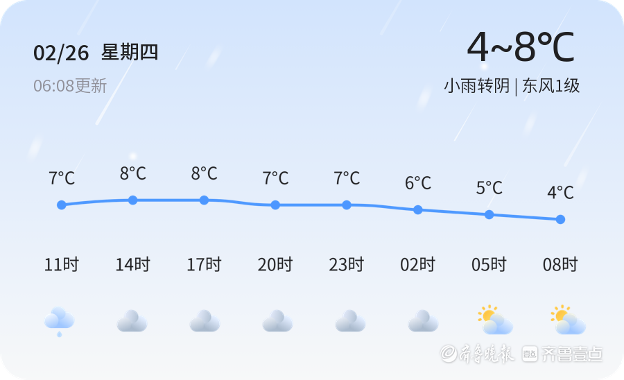 今天是2月26日,正月初十,菏泽市迎来了一轮小雨天气,气温介于4℃到8℃之间,目前温度为5.9℃。风向为东风,风力1级,空气湿度高达94%,PM2.5浓度为57,属于良级,对人体健康影响较小。今天的天气情况对市民的出行带来了一定影响,道路湿滑,能见度较低,建议市民出行时注意防滑和交通安全,尤其是开车的市民应减速慢行,保持车距,确保行车安全。