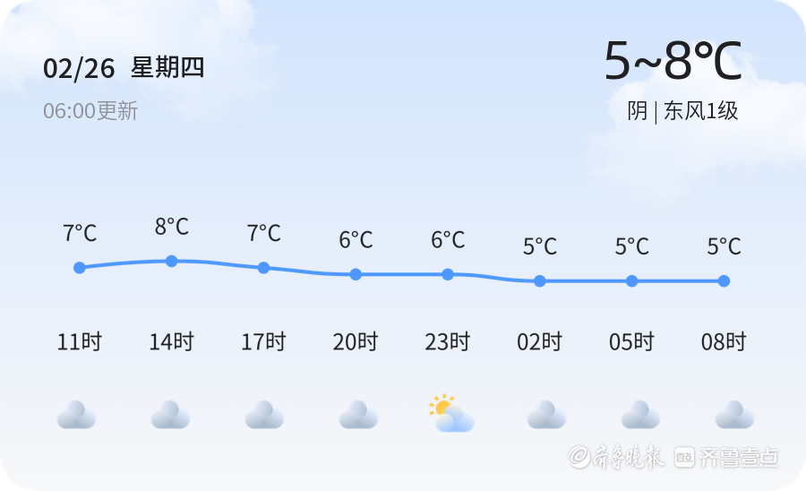 今天是2月26日,星期四,农历正月初十。青岛市今天天气阴沉,气温在5℃到8℃之间,东风1级,空气湿度较高,达到89%。PM2.5浓度为62微克/立方米,空气质量为良。早晨部分地区出现大雾天气,能见度较低,对市民出行造成一定影响。建议市民外出时注意保暖,行车时保持车距,减速慢行,确保安全。