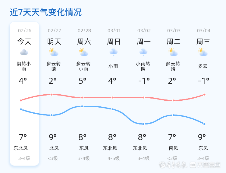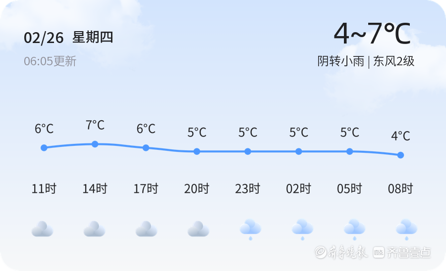 今天是2月26日,正月初十,星期四。日照市今日天气阴转小雨,气温在4℃至7℃之间,东风2级,空气湿度95%。各区天气情况基本一致,均为阴雨天气,市民出行需携带雨具,注意保暖。明日天气与今日相比有所变化,预计为多云转晴,气温略有上升,最低气温2℃,最高气温9℃,风力减弱为北风<3级。市民可抓住明日短暂的晴朗天气,进行户外活动或晾晒衣物。未来三天,日照市天气以多云转小雨为主,气温在2℃至9℃之间波动。2月28日和3月1日将有小雨天气,市民需注意防范雨天路滑对出行的影响。此外,3月1日风力较大,东北风4-5级,建议市民减少户外活动,避免在大树或广告牌下逗留。温馨提示