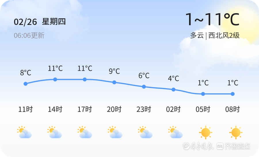 今日是2026年2月26日,正月初十,聊城的天气以多云为主,气温为1℃至11℃。目前温度为5.5℃,西北风2级,空气湿度97%,空气质量良好(PM2.5指数74)。由于天气较冷,市民出行时需注意防风保暖,建议佩戴口罩以防止冷风刺激呼吸道。