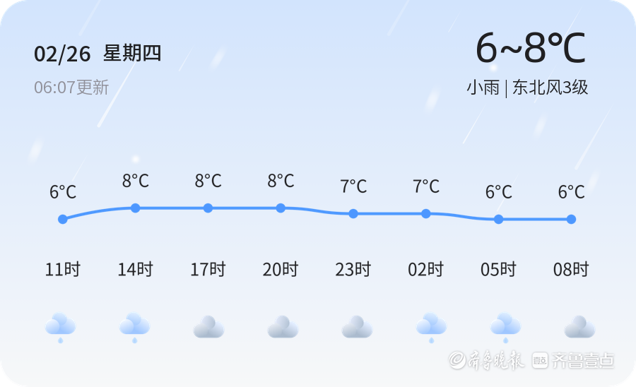 今天是星期四,2月26日,农历正月初十。上午6时07分,临沂市迎来了一天中的小雨天气,气温4.2℃,东北风3级,空气湿度88%,PM2.5指数65。全市各区均出现小雨天气,气温在6℃至8℃之间,市民出行需注意携带雨具并做好防寒准备。