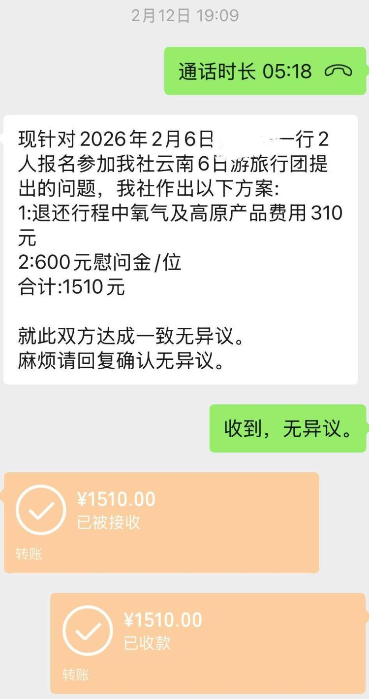 2月12日晚,已结束全部行程的黄女士,与旅行社反复协商后,旅行社退还了氧气罐和高原产品费用310元,并给了黄女士及其丈夫1200元,备注为“慰问金”。