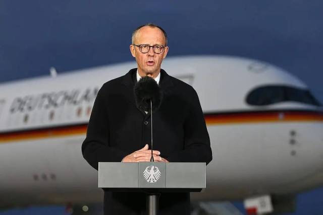当地时间2月24日,德国总理默茨启程访华前发表声明。图源:视觉中国