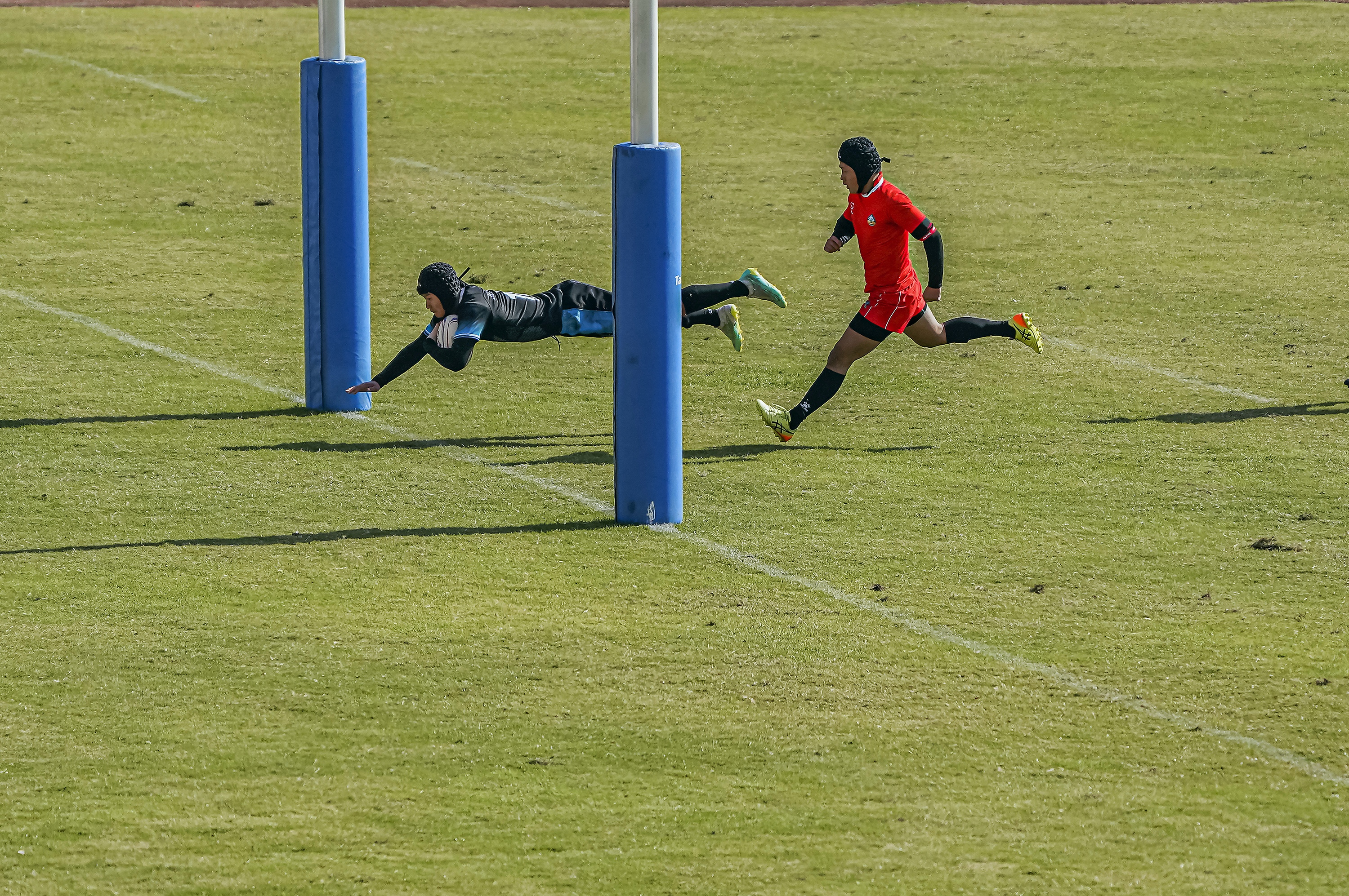 作品介绍:绿茵场上,决胜瞬间!黑衣球员全速推进,成功触地达阵。这一跃,拼的是速度,更是决心!