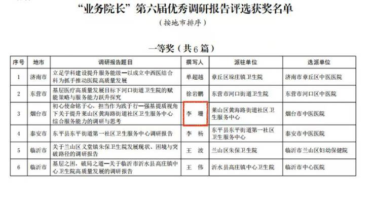 近日,山东省卫生健康委员会举办的全省第六届“业务院长”优秀调研报告评选结果揭晓,莱山区黄海路街道社区卫生服务中心挂职业务院长李珊撰写的调研报告《初心使命铭于心,担当作为践于行——强基提质视角下关于提升莱山区黄海路街道社区卫生服务中心综合服务能力的调研与思考》,凭借扎实的调研、精准的分析和可行的举措,荣获省级一等奖。