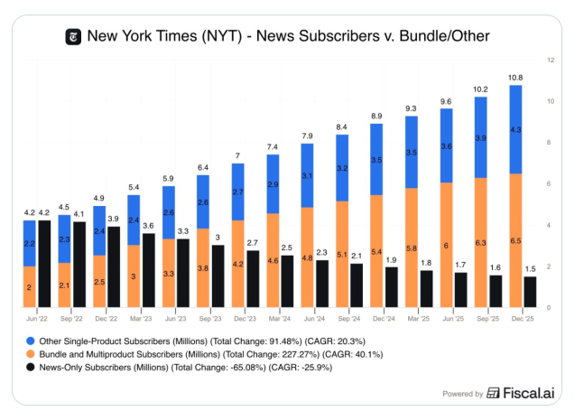 2月21日,X上一则帖文称,“《纽约时报》已不再是一家新闻媒体公司。”该帖文列出一张图表,显示自2022年以来该报纯新闻订户迅速下降,而捆绑有游戏等产品的订户显著上升。2022年6月,纯新闻订户为420万,而捆绑游戏等产品的订户为200万。2025年12月,纯新闻订户骤减至150万,而捆绑游戏等产品的订户增至650万。