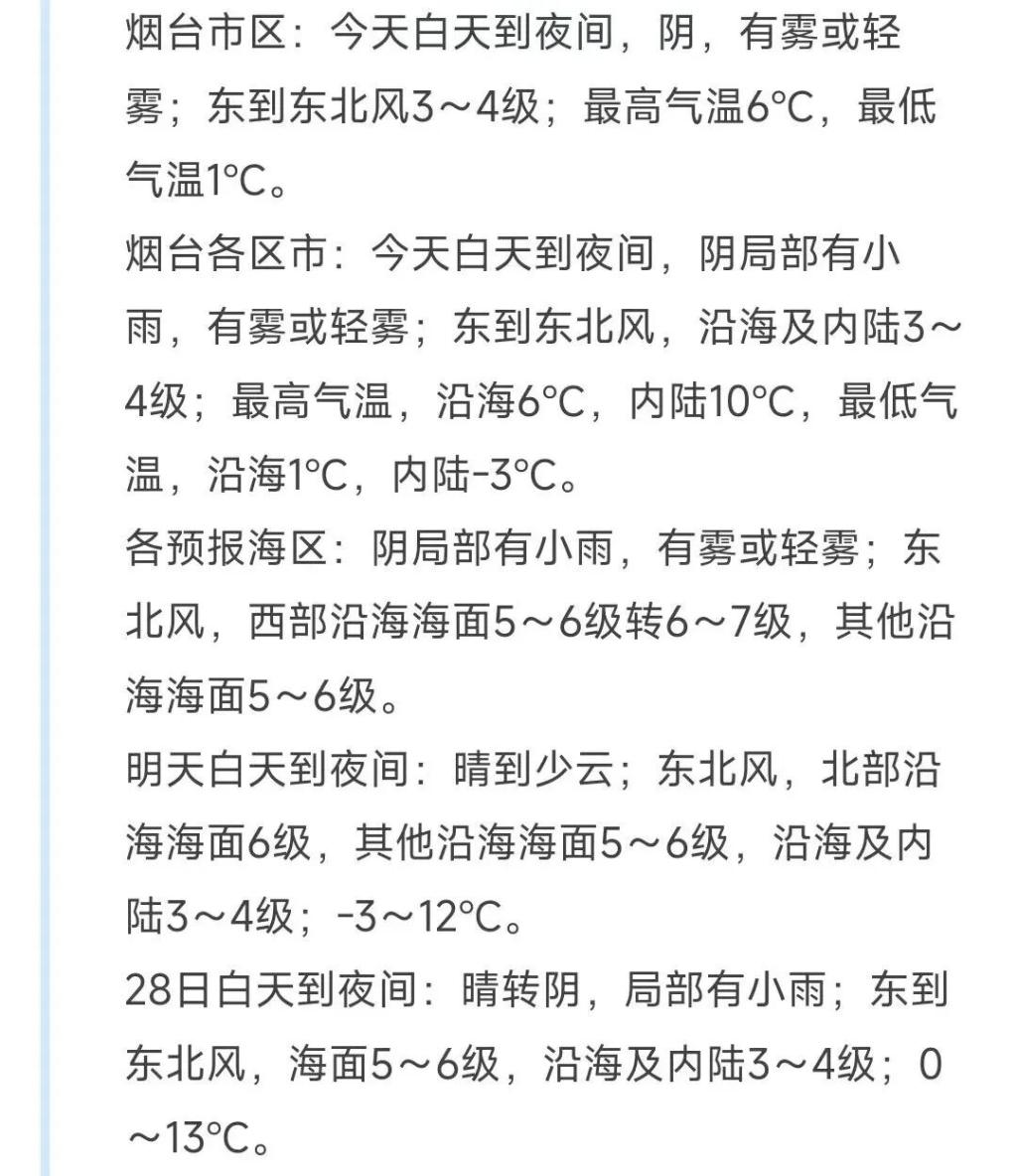 大风警报:烟台西部沿海海面东北风5~6级转6~7级,其他沿海海面东北风5~6级。