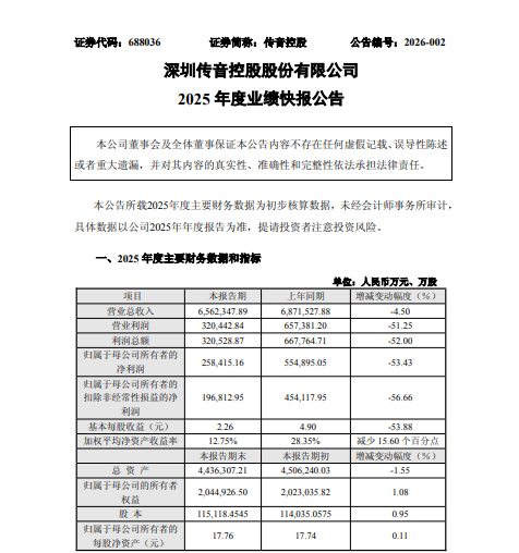 2月25日,传音控股(688036)发布业绩快报,2025年公司实现营收656.23亿元同比下降4.50%;归母净利润为25.84亿元,同比下降53.43%;扣非净利润为19.68亿元,同比下降56.66%。