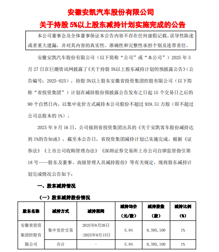 2月25日,安凯客车(000868)公告,持股5%以上股东安徽省投资集团(下称“省投资集团”)在2025年11月27日至2026年2月24日通过集中竞价交易减持219.71万股,占公司总股本的0.23%。粗略估算后,省投资集团本次减持金额约1105.14万元。