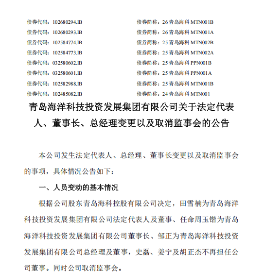 2月25日,青岛海洋科技投资发展集团有限公司(下称“青岛海科投”)发布关于法定代表人、董事长、总经理变更以及取消监事会的公告。