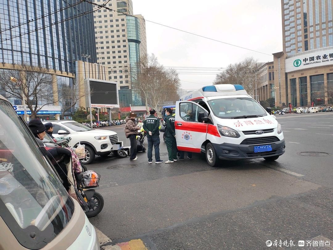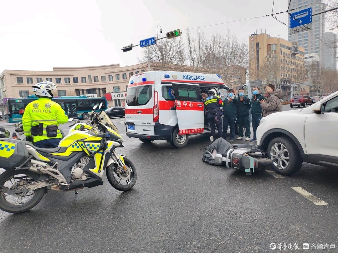 情报站|济南纬二路路口一私家车与电动车相撞,雨天出行注意安全