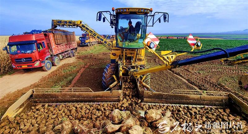 2024年11月3日,察布查尔锡伯自治县琼博拉镇琼博拉村禾谷种植专业合作社的甜菜种植基地里,大型农机在田间采收甜菜,运往糖厂。